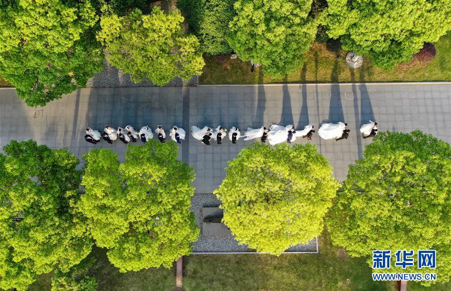 5月19日,新人們在拍攝婚紗照(無人機照片)。當(dāng)日,15對新人在江蘇南京集體拍攝婚紗照,并將參加5月20日在南京舉行的“今世緣白衣天使集體婚禮”。拍攝婚紗照的部分新人此前因馳援武漢或參加所在城市抗疫工作而推遲婚期。新華社記者季春鵬攝