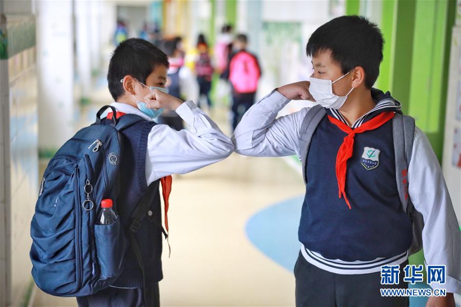 5月25日,北京市朝陽區(qū)實驗小學(xué)貴陽分校的兩個孩子用“碰肘”的方式打招呼。新華社記者劉續(xù)攝