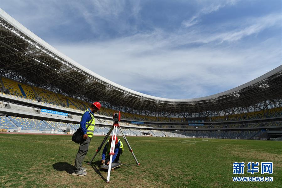 5月29日,工人在西安奧體中心體育場進行場地測量。新華社記者張博文攝
