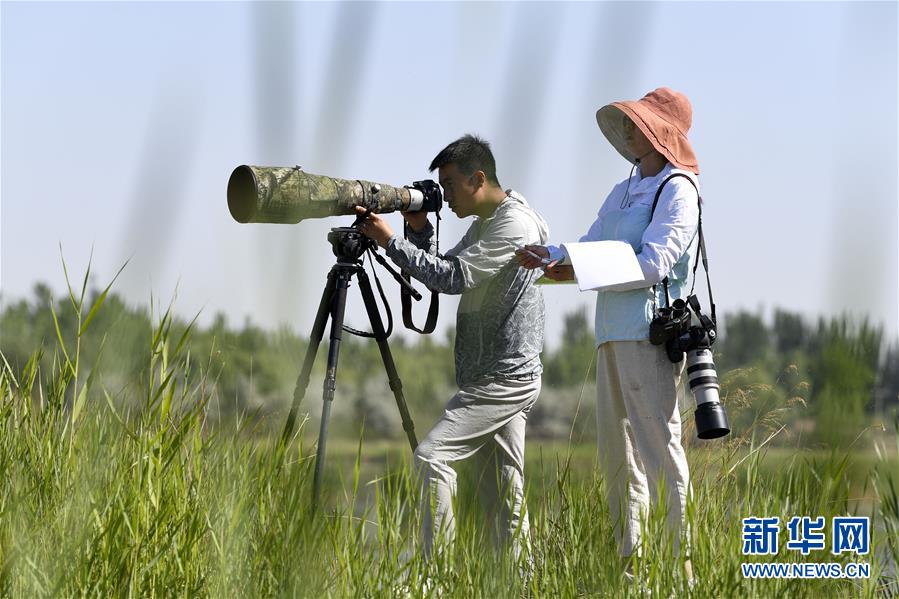 6月3日,李學(xué)明(左)和同事張海榮在監(jiān)測(cè)記錄黃河濕地的鳥(niǎo)類活動(dòng)。新華社記者馮開(kāi)華攝。