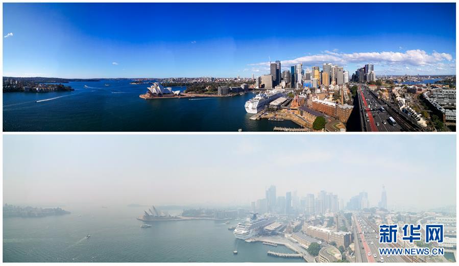 這張拼版照片顯示的是2018年7月6日(上)和2019年12月19日拍攝的澳大利亞悉尼港區(qū)的空氣質(zhì)量對比效果。2019年中至2020年初,持續(xù)半年左右的澳大利亞森林火災造成嚴重的環(huán)境災難。6月5日是第47個聯(lián)合國世界環(huán)境日,今年的主題為“關愛自然刻不容緩”。新華社記者白雪飛攝。
