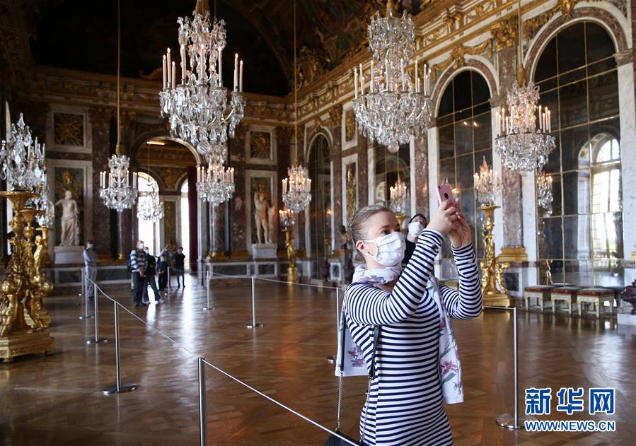 6月6日,一名游客戴著口罩在法國(guó)巴黎近郊凡爾賽宮的鏡廳內(nèi)參觀游覽。 新華社記者 高靜 攝