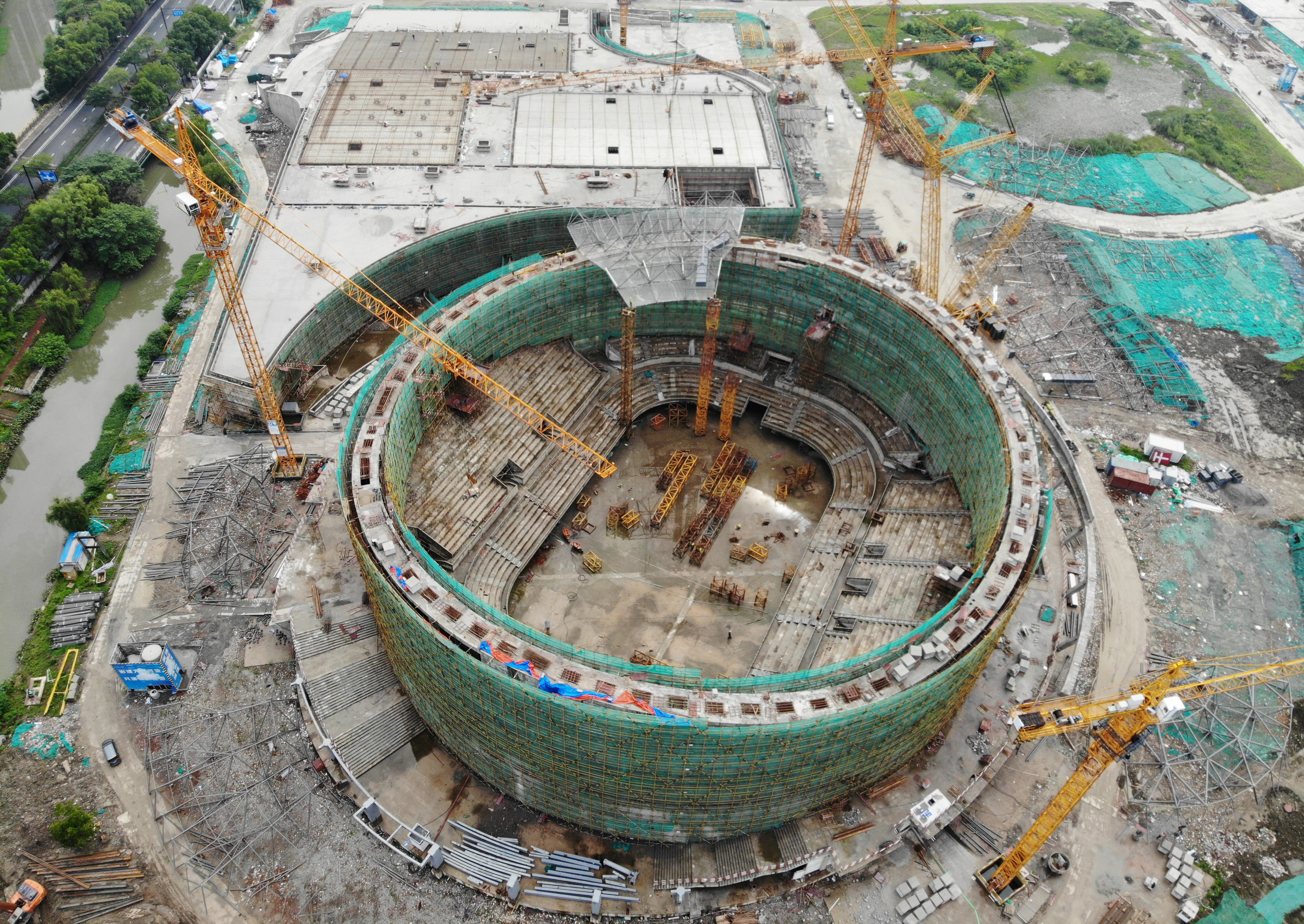 2020年6月9日,從空中俯瞰正在建設中的杭州亞運會乒乓球館。近日,位于杭州運河亞運公園內(nèi)的乒乓球館主體結構完工,開始進入自支撐鋼斜肋系統(tǒng)玻璃立面安裝階段。據(jù)了解,杭州亞運會乒乓球館占地1.94萬平方米,將建成12片標準乒乓球場地,并可容納5000-6500位觀眾。該乒乓球館設計靈感來源于杭州良渚文化中的“玉文化”,采用了“琮”的樣子。