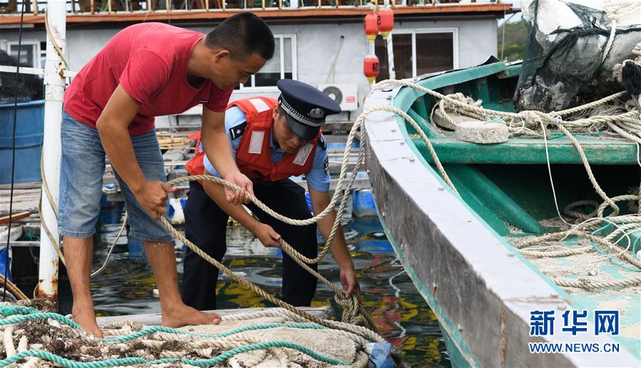 6月13日,海南省公安廳海岸警察總隊(籌備組)陵水支隊民警幫助轄區(qū)內(nèi)漁民固定漁船。當日,海南省氣象局于16時30分繼續(xù)發(fā)布臺風(fēng)四級預(yù)警。今年第2號臺風(fēng)“鸚鵡”(熱帶風(fēng)暴級)預(yù)計于14日在廣東沿海登陸。新華社記者楊冠宇攝。