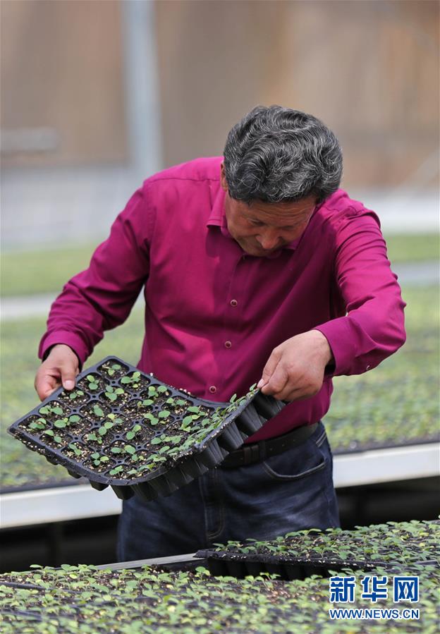 在遼寧省盤錦市大洼區(qū)新興鎮(zhèn)坨子里村,劉廣會(huì)在自己經(jīng)營的育苗企業(yè)內(nèi)查看蔬菜種苗生長情況(6月9日攝)。新華社記者 楊青 攝