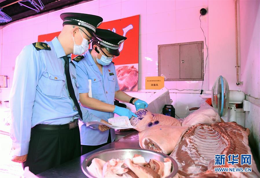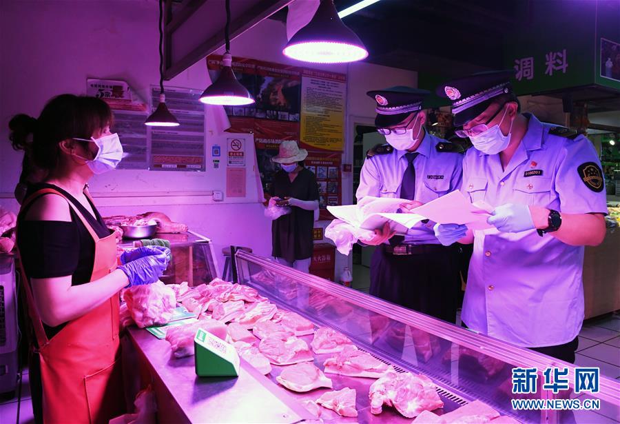 6月17日,在位于北京市海淀區(qū)的增光鴻運(yùn)市場,執(zhí)法人員對商戶出售的鮮肉進(jìn)行檢查。新華社記者 任超 攝