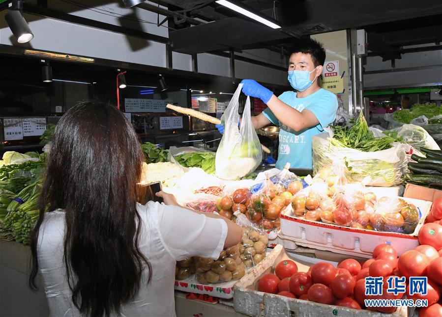 6月17日,在位于北京市海淀區(qū)的增光鴻運(yùn)市場,市民(左)在購買蔬菜。新華社記者 任超 攝