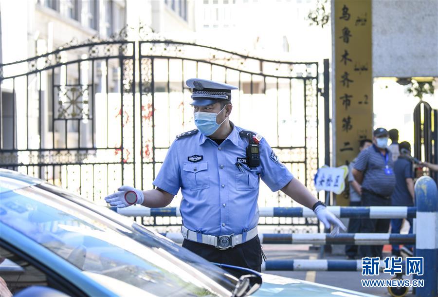 6月20日,在烏魯木齊市第二中學(xué)門(mén)前,烏魯木齊市公安局交警支隊(duì)天山區(qū)大隊(duì)新華路中隊(duì)警官羅曉亮在指揮交通。當(dāng)日,烏魯木齊市初中升高中考試開(kāi)始。為保障為期三天的中考順利進(jìn)行,烏魯木齊市公安局交警支隊(duì)在各考點(diǎn)執(zhí)勤,為考生保駕護(hù)航新華社記者 王菲 攝
