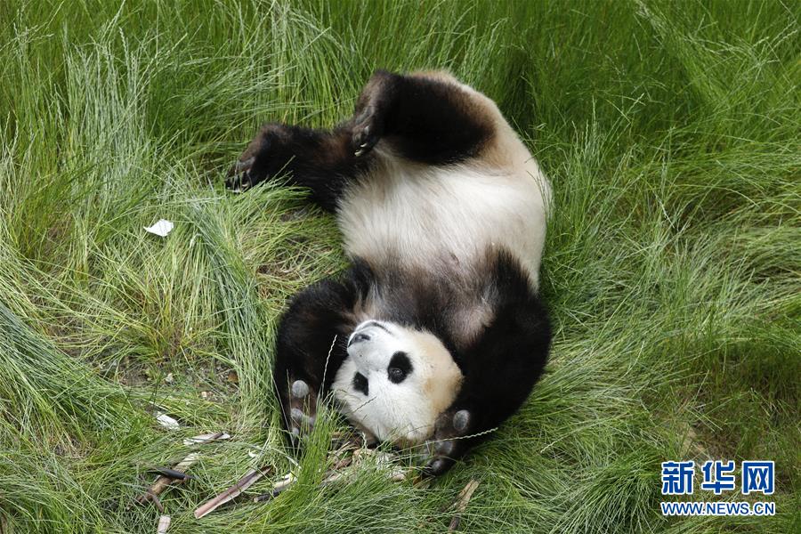 在位于四川省阿壩藏族羌族自治州的九寨溝大熊貓園,大熊貓“海?!痹谕嫠#?月19日攝)。新華社記者沈伯韓攝