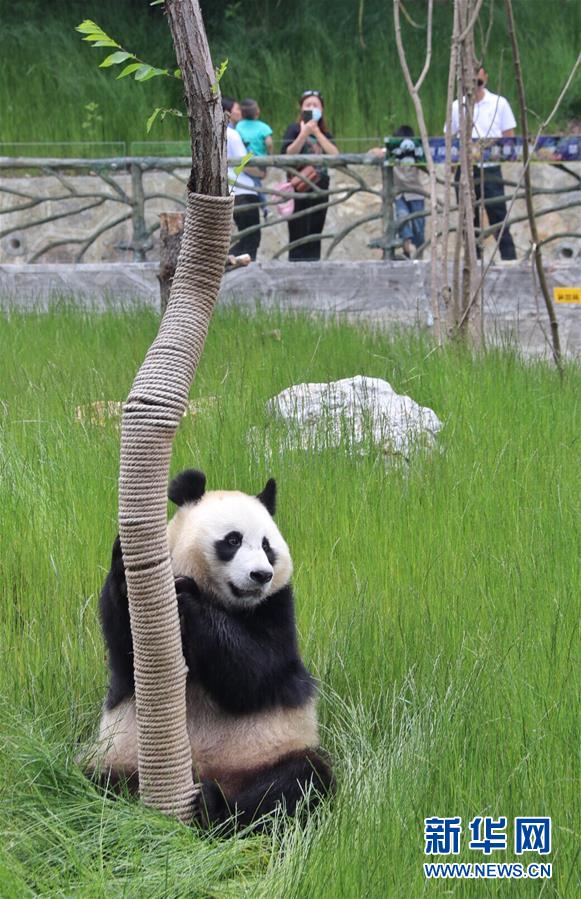 在位于四川省阿壩藏族羌族自治州的九寨溝大熊貓園,大熊貓“海?!痹诖驖L(6月19日攝)。新華社記者沈伯韓攝
