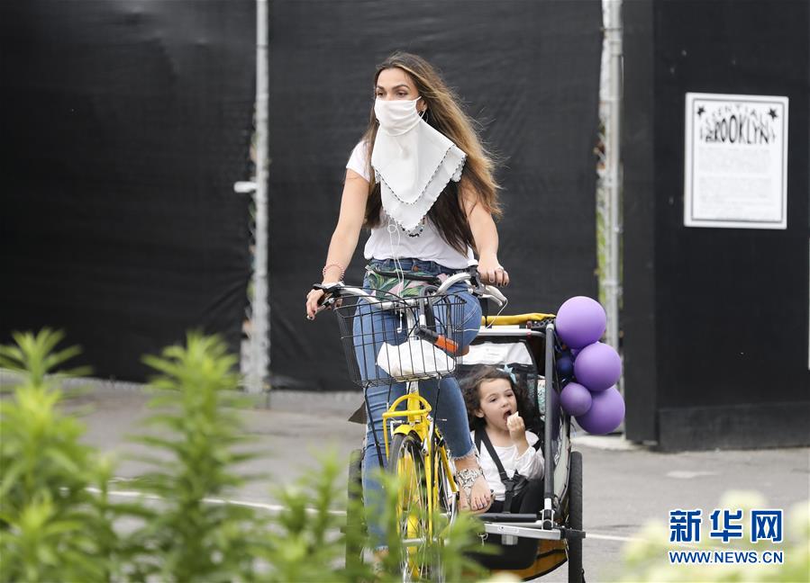 6月27日,一名女士在美國紐約多米諾公園內騎車帶孩子游玩。美國約翰斯·霍普金斯大學27日發(fā)布的新冠疫情最新統計數據顯示,截至美國東部時間27日16時35分(北京時間28日4時35分),美國累計新冠確診病例2500419例,累計死亡病例125434例。新華社記者王迎攝