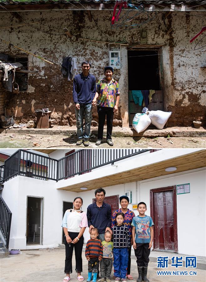 拼版圖片:上圖為且沙次干、阿達(dá)么日雜夫婦倆在阿布洛哈村3組老屋土坯房前留影(6月27日攝);下圖為且沙次干一家人在集中安置點新居前留影(6月30日攝)。