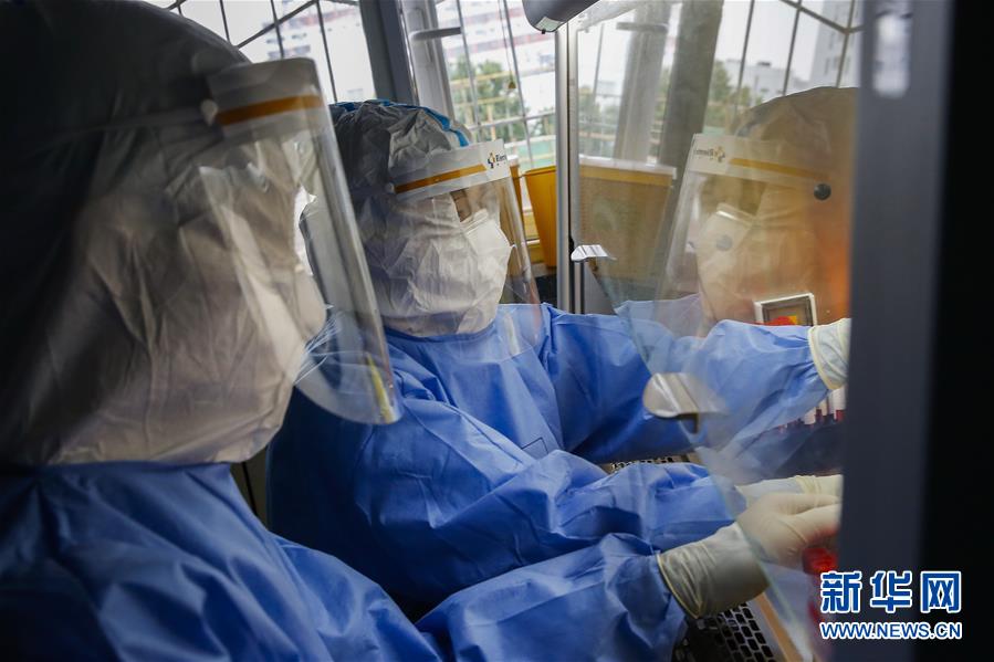 7月3日,中日友好醫(yī)院檢驗(yàn)科新冠核酸檢測(cè)實(shí)驗(yàn)室的檢驗(yàn)人員閆克芹和張?chǎng)危ㄗ螅┰趯?shí)驗(yàn)室內(nèi)處理剛剛送到的樣本。新華社記者張玉薇攝