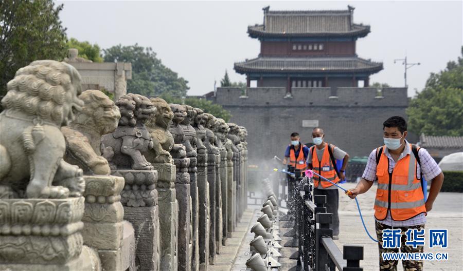 7月4日,防疫人員在盧溝橋景區(qū)進行環(huán)境消毒。當(dāng)日,北京市豐臺區(qū)組織防疫人員、安全監(jiān)察部門人員對社區(qū)、超市、公共場所進行大規(guī)模環(huán)境消毒及疫情隱患排查,全力保障市民生活和工作環(huán)境安全。新華社記者 李欣 攝