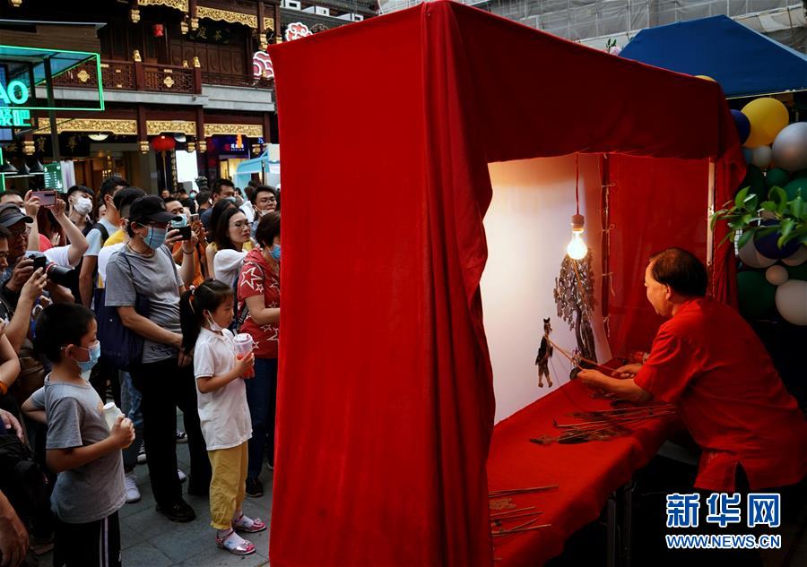 7月3日,游人在上海豫園中心廣場(chǎng)上觀看皮影表演。從7月第一個(gè)周末起,上海豫園原有的“豫園六點(diǎn)半”集市全面升級(jí),煥彩燈光、演藝活動(dòng)和花車(chē)集市全線更新,讓市民和游客在觀燈、觀人、觀演的沉浸式體驗(yàn)中,享受夏日特色的“食玩”樂(lè)趣。新華社記者 劉穎 攝