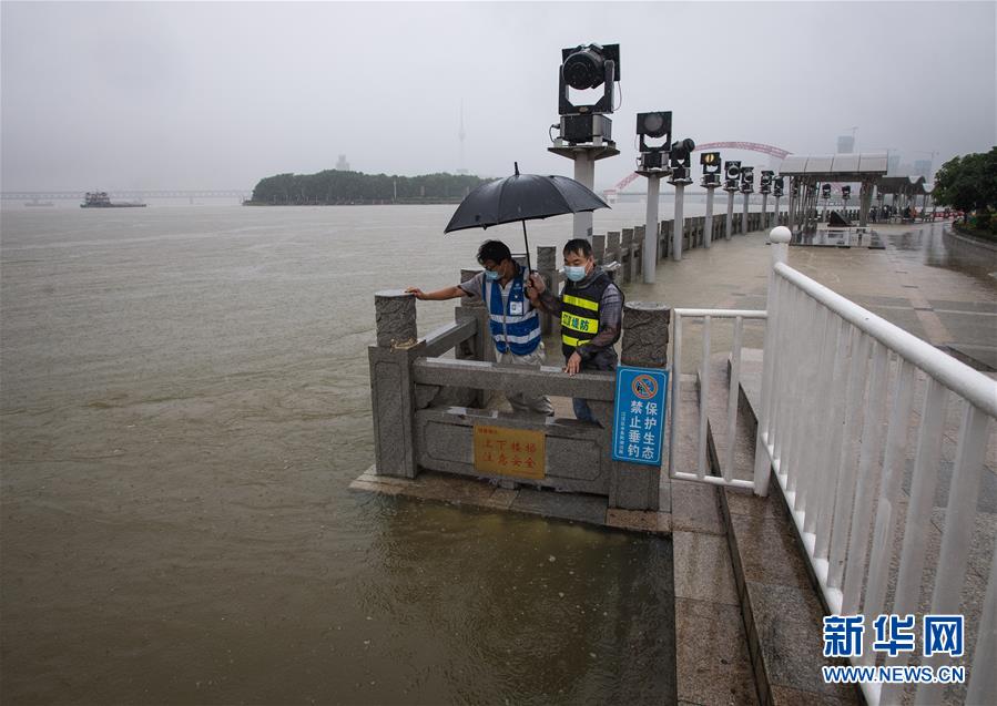 7月6日,工作人員在武漢龍王廟觀察水情。記者6日從武漢市防汛抗旱指揮部辦公室獲悉,5日以來,武漢遭暴雨襲擊,全市多處路段漬水。至6日4時,長江漢口站超設(shè)防水位1.79米,漢江新溝站超警戒水位0.01米。鑒于當前水雨汛情和漬澇情況,武漢市從6日5時起,將排澇應急響應級別提升至Ⅱ級;從6時30分起,將防汛應急響應級別提升至Ⅱ級。新華社記者肖藝九攝