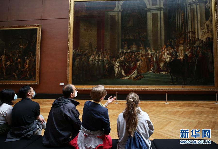 7月6日,參觀者在法國(guó)巴黎盧浮宮博物館欣賞畫(huà)作《拿破侖加冕》。因新冠病毒疫情關(guān)閉3個(gè)多月后,法國(guó)盧浮宮博物館于6日重新開(kāi)放。新華社記者高靜攝
