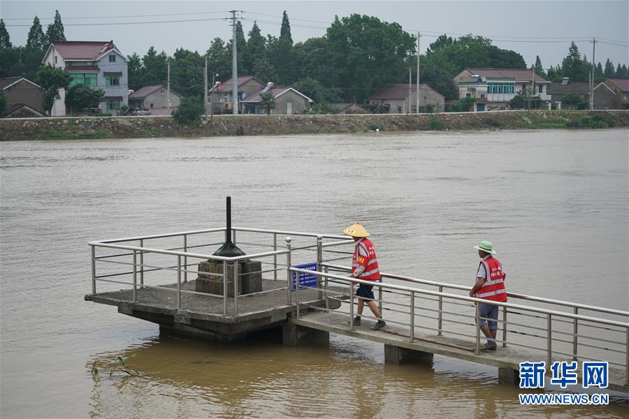 7月9日,在高淳區(qū)陽江鎮(zhèn)永豐圩,巡堤員在進行“水牌”(巡堤查險責任牌)交接。新華社記者季春鵬攝