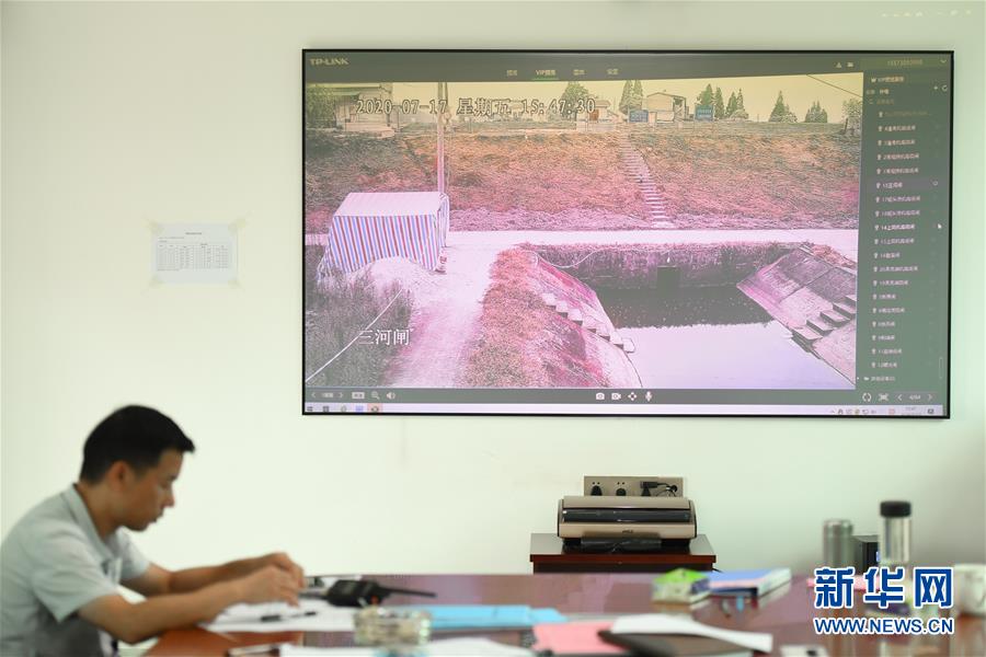 7月17日,在岳陽市華容縣治河渡鎮(zhèn)防汛抗旱指揮所,大屏實(shí)時(shí)顯示新華垸三門閘附近情況。為力爭安全度汛,湖南省岳陽市華容縣織密人防、物防、技防“三防”網(wǎng)絡(luò),加強(qiáng)應(yīng)急值守和巡查排險(xiǎn)工作,采取“以船代倉”“以車代倉”等多種方式靈活儲(chǔ)備防汛物資,在險(xiǎn)工險(xiǎn)段布置攝像頭實(shí)時(shí)監(jiān)控,利用無人機(jī)對(duì)人員難以到達(dá)的位置進(jìn)行巡查。新華社記者陳澤國攝
