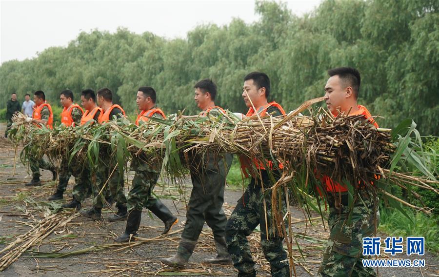 在鎮(zhèn)江市丹徒區(qū)世業(yè)鎮(zhèn)先鋒村西南大堤,中國安能集團第二工程局常州分公司防汛前置備勤隊員準(zhǔn)備將捆好的蘆葦放在江堤邊(7月17日攝)。捆蘆葦護邊坡、機器人進涵洞、“養(yǎng)水盆”防滲漏……在江蘇鎮(zhèn)江,當(dāng)?shù)馗刹咳罕姾蛯I(yè)力量,因地制宜就地取材,老辦法搭配新技術(shù),一批險情得以消除在萌芽狀態(tài)。新華社記者季春鵬攝
