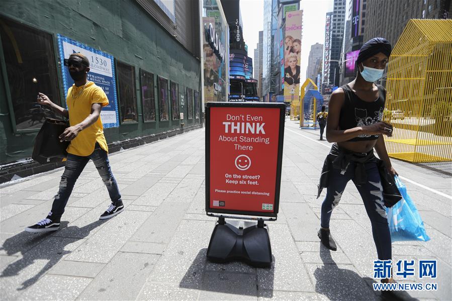 7月23日,在美國紐約時報(bào)廣場,人們從保持社交距離的提示牌旁走過。美國約翰斯·霍普金斯大學(xué)23日發(fā)布的新冠疫情最新統(tǒng)計(jì)數(shù)據(jù)顯示,美國累計(jì)確診病例超過400萬例。數(shù)據(jù)顯示,截至美國東部時間23日15時34分(北京時間24日3時34分),美國累計(jì)確診病例4007859例,累計(jì)死亡病例143846例。新華社記者王迎攝