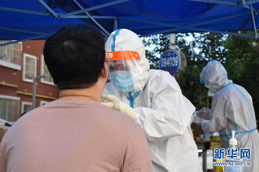 8月5日,醫(yī)務(wù)工作者在烏魯木齊市天山區(qū)山西巷社區(qū),對居民開展免費核酸檢測服務(wù)。新華社記者高晗攝