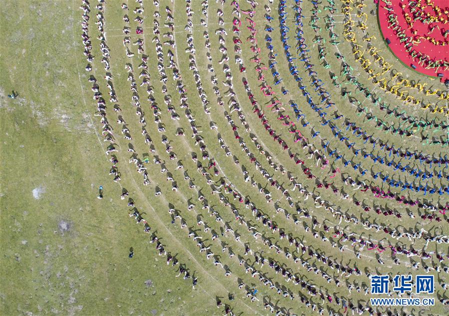 西藏首屆弦子舞展演現(xiàn)場(8月7日攝,無人機照片)。當日,西藏首屆弦子舞展演在昌都市芒康縣舉行。眾多演員同臺獻藝,表演國家級非物質文化遺產弦子舞,吸引西藏各地的群眾前來觀看。新華社記者孫非攝