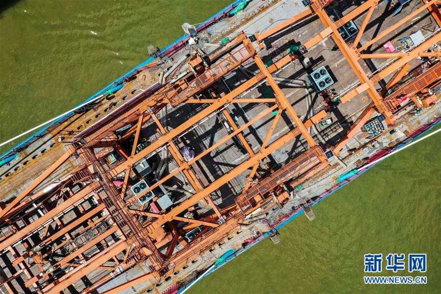 8月9日拍攝的廣州南沙港鐵路跨西江特大斜拉橋最后一塊鋼箱梁吊裝施工現(xiàn)場(無人機照片)。當(dāng)日,中鐵十一局承建的粵港澳大灣區(qū)基礎(chǔ)設(shè)施“硬聯(lián)通”重點工程——廣州南沙港鐵路跨西江特大斜拉橋完成最后一塊鋼箱梁吊裝作業(yè),大橋即將合龍。該橋位于廣東佛山市和江門市交界處,全長1117.5米。新華社記者劉大偉攝。