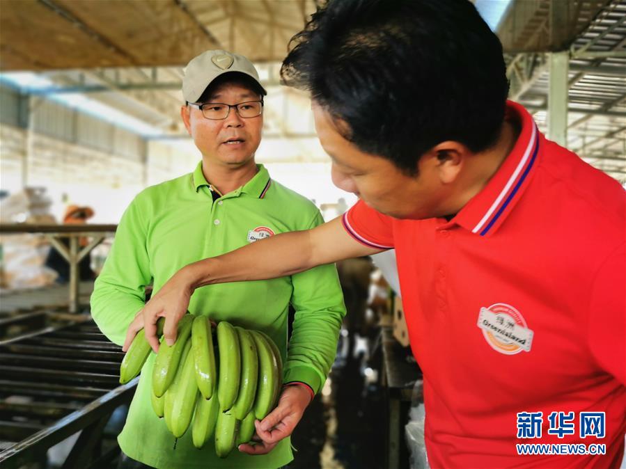 7月16日,在柬埔寨桔井省的柬埔寨—中國熱帶生態(tài)農業(yè)合作示范區(qū)內,綠洲農業(yè)發(fā)展(柬埔寨)有限公司總經理高冠華(右)和公司香蕉產業(yè)技術副總監(jiān)吳誠檢查香蕉的品質(手機拍攝)。新華社記者毛鵬飛攝。