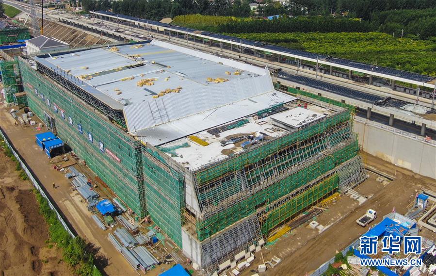 8月10日拍攝的建設(shè)中的京雄城際鐵路霸州北站(無人機(jī)照片)。京雄城際鐵路霸州北站站臺(tái)雨棚混凝土結(jié)構(gòu)施工日前全部完成,目前霸州北站已全面轉(zhuǎn)入裝飾裝修和機(jī)電安裝階段,預(yù)計(jì)2020年底投入使用。京雄城際鐵路是連接北京市區(qū)、大興機(jī)場(chǎng)和雄安新區(qū)的重要干線。建成后,將進(jìn)一步完善京津冀區(qū)域高速鐵路網(wǎng)結(jié)構(gòu),便利沿線群眾出行,對(duì)于推動(dòng)京津冀協(xié)同發(fā)展和支撐建設(shè)雄安新區(qū)具有重要意義。新華社記者李曉果攝。