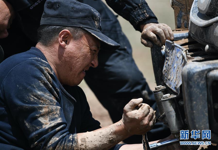 7月6日,卓乃湖保護站站長秋培扎西在可可西里地區(qū)修理車輛。新華社記者薛玉斌攝
