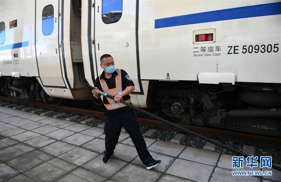 8月12日,長(zhǎng)春火車(chē)站客運(yùn)車(chē)間上水工常明為剛剛到站的一趟列車(chē)上水。新華社記者 林宏 攝