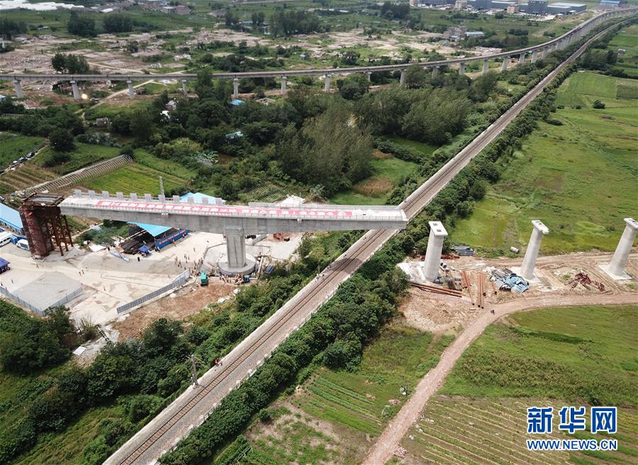 這是8月12日拍攝的水蚌鐵路蚌埠段改線工程?hào)|站疏解線特大橋跨越京滬鐵路上行線轉(zhuǎn)體梁轉(zhuǎn)體施工現(xiàn)場(chǎng)(無(wú)人機(jī)照片)。新華社記者 劉軍喜 攝