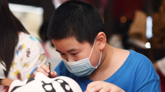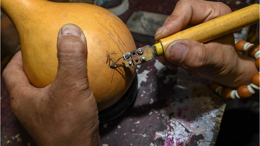 8月5日,侯景偉在葫蘆上進行創(chuàng)作。經過多年潛心研究,他將浮雕和烙畫工藝相結合,通過拋光、起稿、雕刻、烙燙、套色等十余道工藝,制作展現(xiàn)傳統(tǒng)文化、民俗故事的葫蘆工藝品。