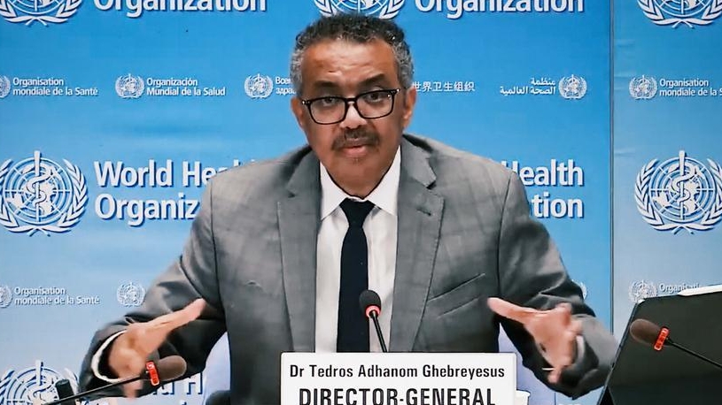 這是8月6日在比利時布魯塞爾拍攝的世界衛(wèi)生組織總干事譚德塞在瑞士日內瓦出席線上記者會的視頻畫面。
