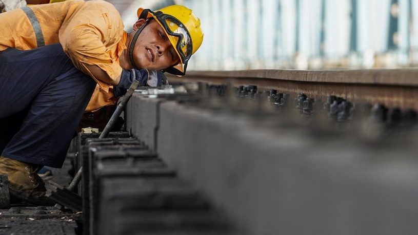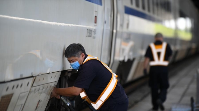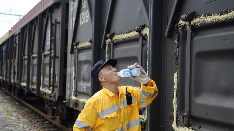 進入暑運高峰,為了保障列車正常用水,每當一列火車??寇囌荆L春火車站的上水工就冒著酷暑將水管插進火車底部的輸水口,快速準確完成輸水作業(yè)。