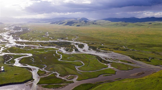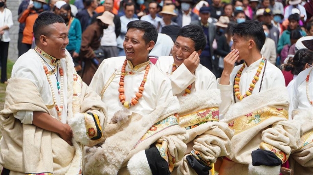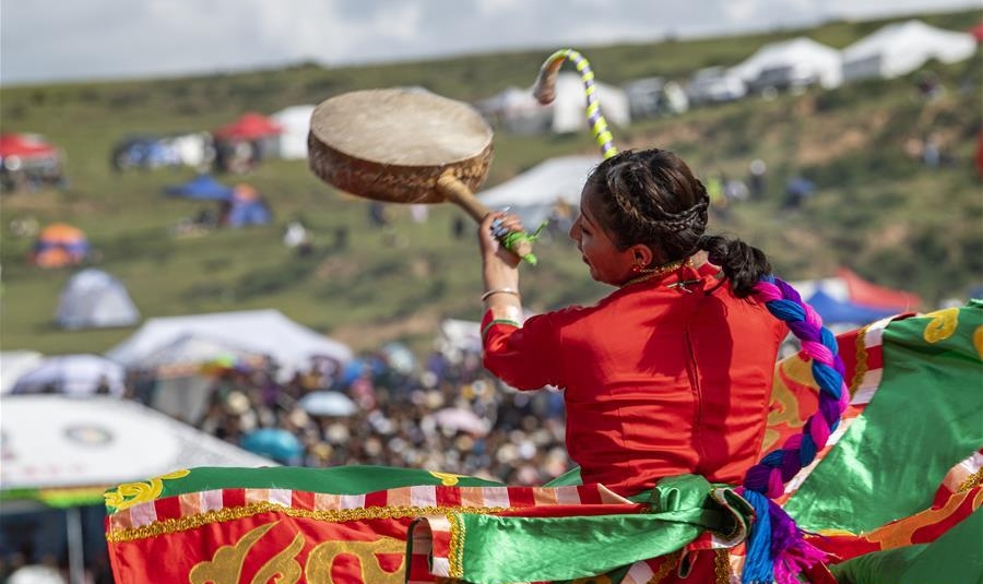 8月12日,2020中國碌曲鍋莊舞展演暨甘南藏族自治州第六屆少數(shù)民族傳統(tǒng)體育運動會在甘肅省甘南州碌曲縣夏澤灘草原上舉行。開幕式上,三千余名身著節(jié)日盛裝的演員和當?shù)厝罕娫诓菰掀鹞?,雨后初晴的草原上充滿歡聲笑語。