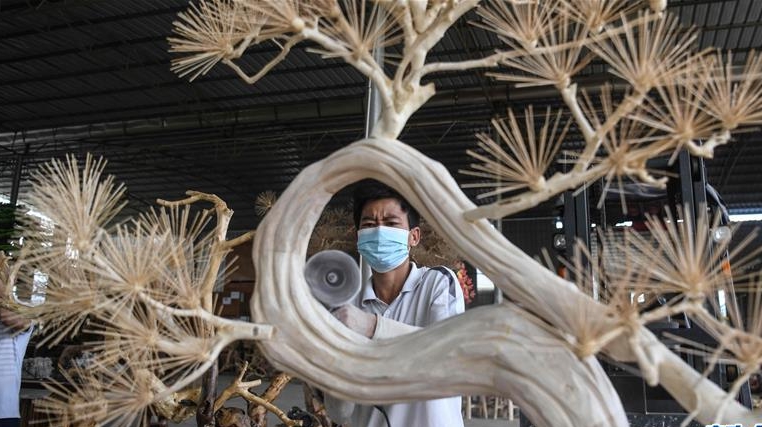 8月7日,一名工人在永??h永安鄉(xiāng)根雕工藝品就業(yè)扶貧車間搬運根雕半成品。新華社記者 張愛林 攝 這是8月7日在永??h永安鄉(xiāng)根雕工藝品就業(yè)扶貧車間拍攝的根雕工藝品。