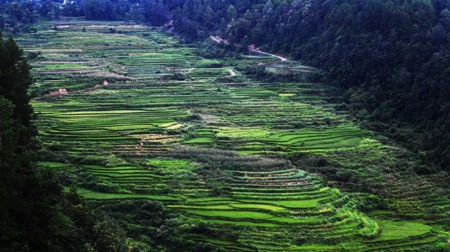 時下,重慶市彭水苗族土家族自治縣鞍子鎮(zhèn)大林村的梯田景色迷人,構成一幅幅山鄉(xiāng)田園美景。