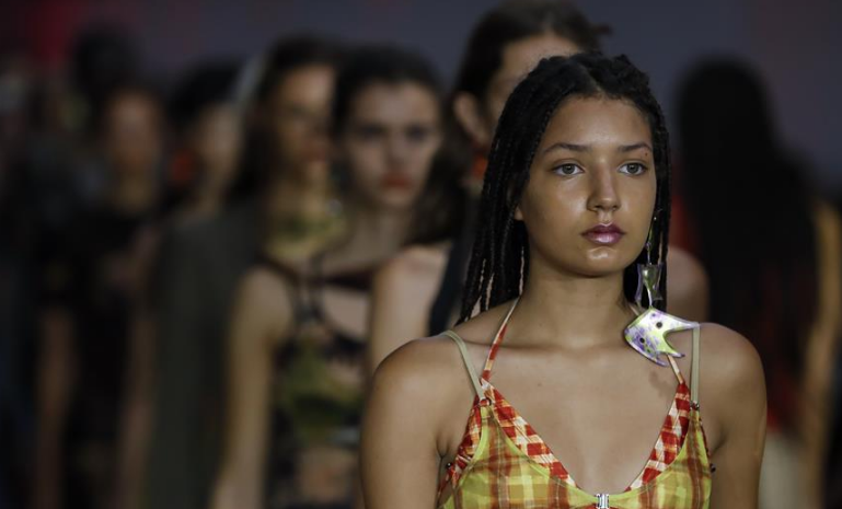 9月17日,在英國倫敦,模特在2020倫敦春夏時裝周上展示Charlotte Knowles品牌服飾(多重曝光)。