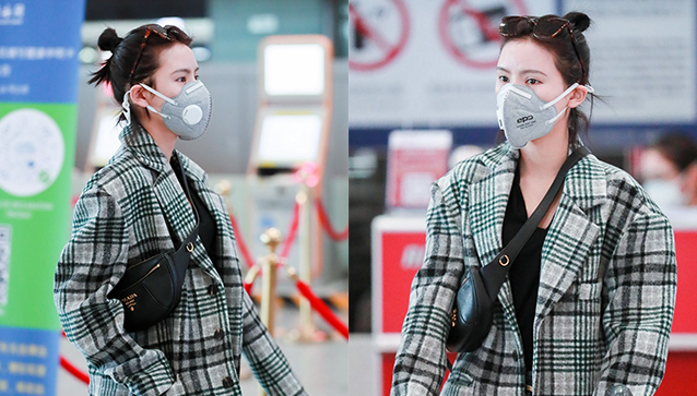 張予曦扎丸子頭穿格子西裝又美又颯 搭配斜挎小包潮范十足