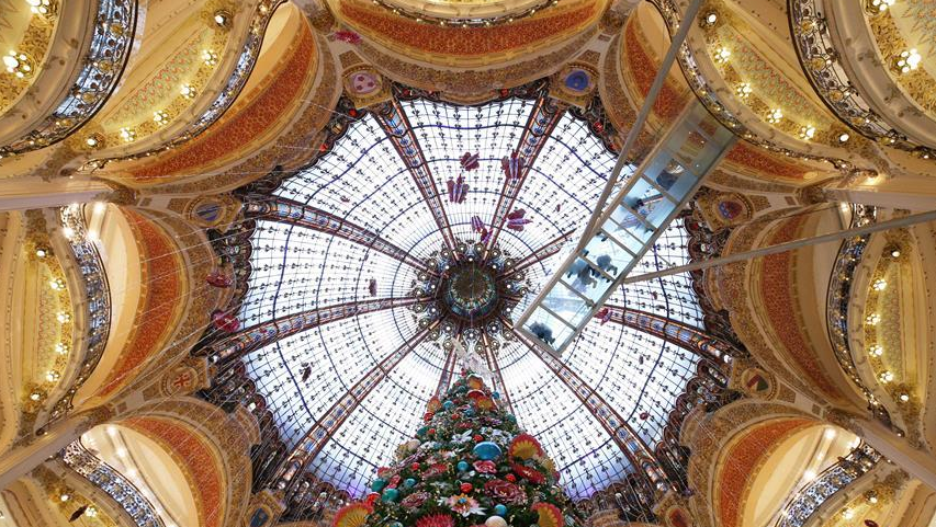近日,法國巴黎老佛爺百貨公司立起巨型圣誕樹,璀璨的燈光和精美的造型設(shè)計吸引了眾多市民和游客前來參觀。