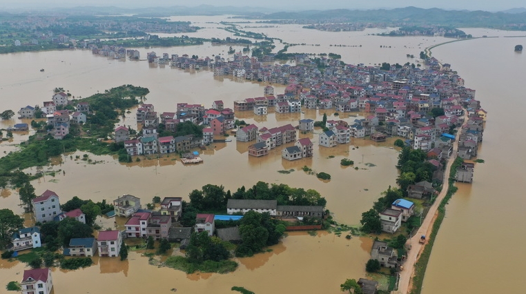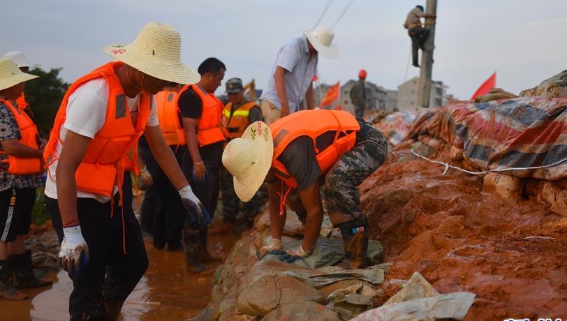在江西鄱陽縣昌江圩,武警江西總隊(duì)機(jī)動支隊(duì)的工作人員和當(dāng)?shù)卮迕褚黄鹂干炒庸疼椎?