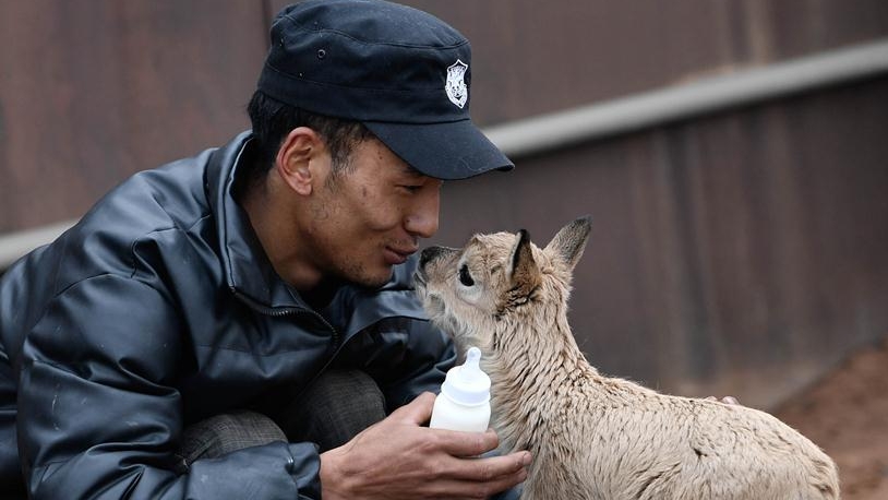 7月7日,三江源國家公園管理局長江源園區(qū)可可西里管理處卓乃湖保護(hù)站的工作人員才文多杰在給藏羚羊幼仔喂奶。