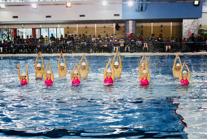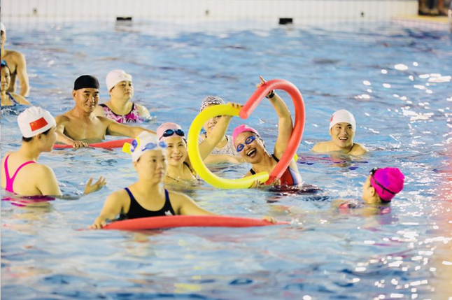 活動伊始,來自廣州體育學院的水中健身操教練團隊為大家?guī)砹司实乃屑w徒手操、水中集體太極、水中集體恰恰、水中集體健身棒操、水中集體深水操表演。接下來的體驗時間,身著泳衣的學員們在專業(yè)教練的指導下進行熱身活動。十分鐘左右的熱身活動結束后,學員們走下泳池踩著音樂的節(jié)拍于水中體驗水中游戲、健身徒手操、手中太極等課程,學員們在教練的帶動下,熱情的學習跑、跳、拉伸等動作,利用水的阻力、浮力和傳熱性進行全身耗氧運動。