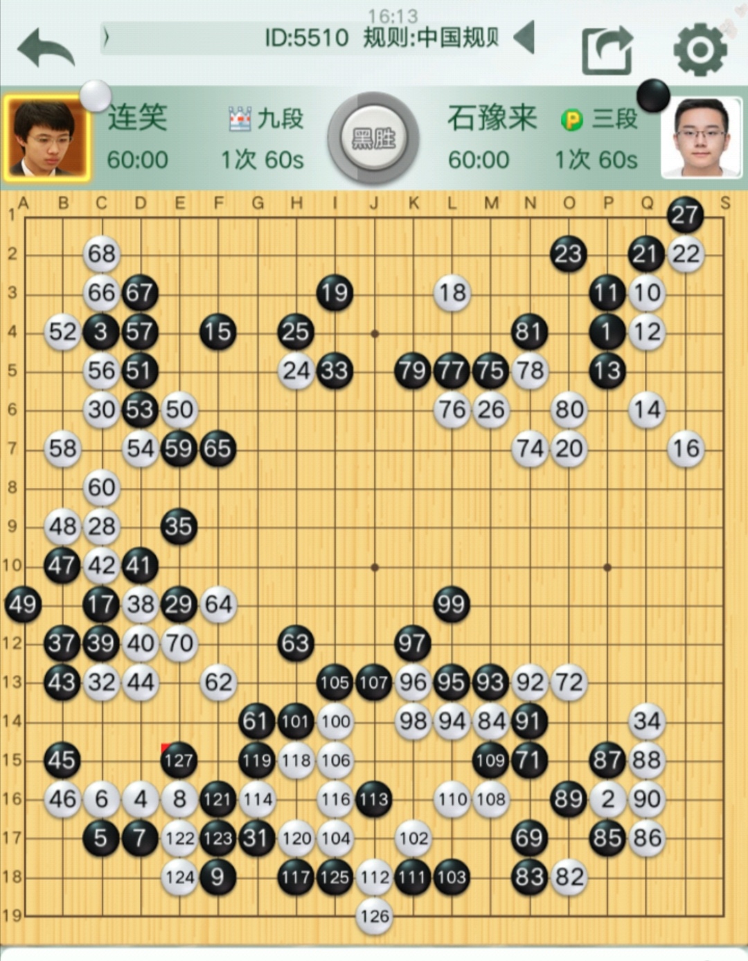 第四臺連笑九段VS石豫來三段(對局棋譜)。石豫來又發(fā)猛力,再下一城。連笑九段前三輪皆敗,本輪執(zhí)白對石豫來三段,先手壓縮上邊盤黑陣后優(yōu)勢在握,但隨即白棋打入下邊盤黑陣全部遭屠,連笑再敗一局,狀態(tài)低迷之極。