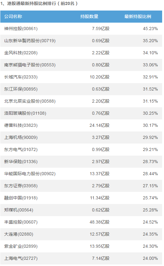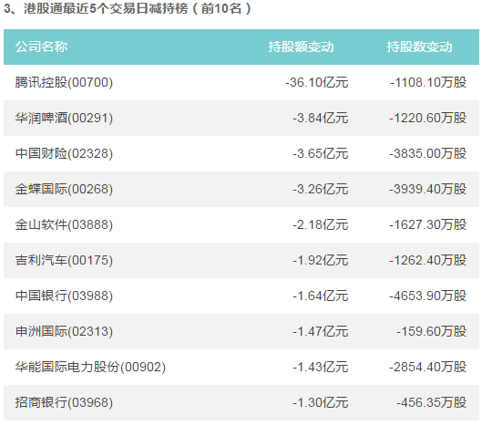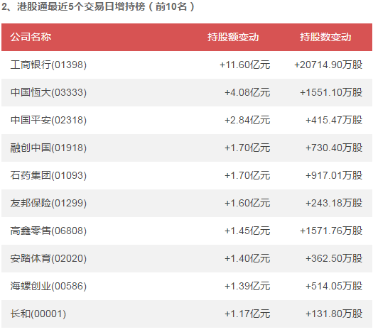 智通財(cái)經(jīng)APP獲悉,截止2018年8月16日,神州控股(00861)、山東新華製藥股份(00719)、金風(fēng)科技(02208)位居港股通持股比例前3位,分別為45.23%、35.20%、34.10%。此外,工商銀行(01398)、中國(guó)恆大(03333)、中國(guó)平安(02318)在最近5個(gè)交易日內(nèi),持股額增幅最大,分別為+11.60億元、+4.08億元、+2.84億元;騰訊控股(00700)、華潤(rùn)啤酒(00291)、中國(guó)財(cái)險(xiǎn)(02328)在最近5個(gè)交易日內(nèi),持股額減幅最大,分別為-36.10億元、-3.84億元、-3.65億元。