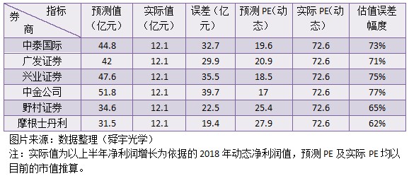 舜宇光學的市值為998億港元,僅為騰訊的3%,騰訊波動一個點的市值,就相當于舜宇光學波動33.3%,肯定比不了。不過以打臉的程度來說,舜宇光學有點過了,預測值與實際值的估值誤差達70%左右,這臉打的確實響。