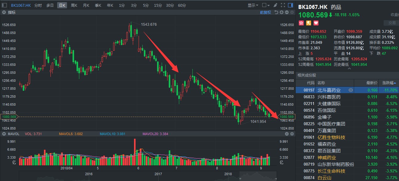 據(jù)智通財(cái)經(jīng)APP觀察,截至9月10日,上證跌了1.21個(gè)點(diǎn);恒指跌幅超過1.33%,50只成分股,僅包括九龍倉置業(yè)(01997)在內(nèi)的6只股票小范圍飄紅,而醫(yī)藥板塊方面,繼續(xù)下挫,普遍以“掛綠”收盤,大勢可謂慘不忍睹。