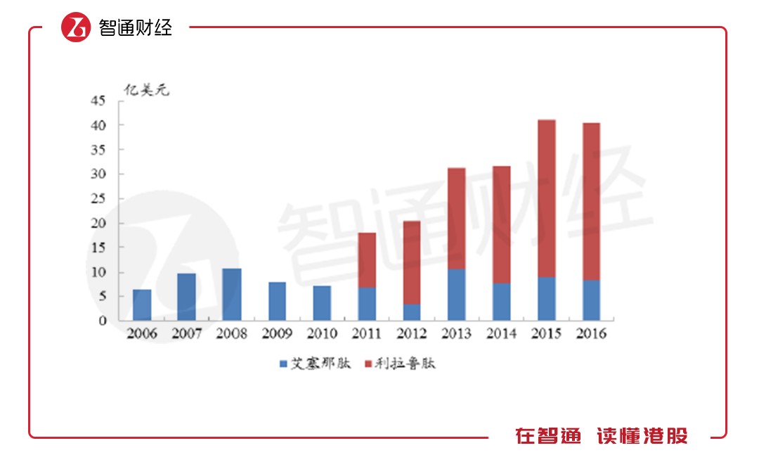 從2005年發(fā)展至今,全球已有6種GLP-1受體激動(dòng)劑相繼獲批上市,整個(gè)GLP-1受體激動(dòng)劑類藥物的全球市場規(guī)模已超過40億美元,2011-2016年的復(fù)合增長率超過15%。而艾塞那肽作為最早上市的GLP-1類似物,上市后銷售額快速增長,早在2008年就突破10億美元。